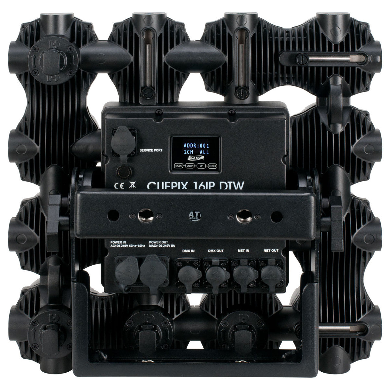 The CUEPIX 16IP DTW is a powerful IP65 outdoor rated effect panel luminaire that features a 4x4 array of 16x40W DTW COB LEDs, full pixel control and 16-bit dimming, variable dimming curve modes, high speed electronic shutter and strobe, adjustable LED refresh rate and gamma brightness for flicker free operation for TV and FILM, no fans for noise-sensitive applications, DMX, RDM (Remote Device Management), Kling-NET, and Art-NET protocol support, IP65 rated locking 5pin XLR DMX, RJ45 ethernet, and power in/out connections, full color 180° reversible LCD control panel, and a multi-voltage universal auto switching power supply (100-240v).